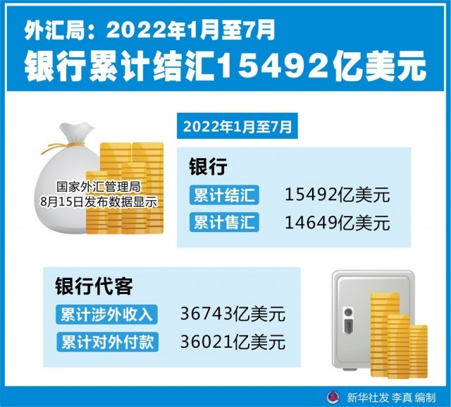 新華社北京8月15日電(記者劉開雄)國家外匯管理局15日發(fā)布數(shù)據(jù)顯示,今年1月至7月,銀行累計(jì)結(jié)匯15492億美元,累計(jì)售匯14649億美元;銀行代客累計(jì)涉外收入36743億美元,累計(jì)對外付款36021億美元。