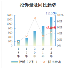 2022年,全國市場監(jiān)管部門受理消費者投訴1310.38萬件,同比增長43.84%,增速較2021年有所放大。其中,售后服務(wù)問題增長最快,群眾反映最強烈,同比增長57.67%。消費者訴求主要集中在不退款、不發(fā)貨、不履行“三包”承諾、不落實七天無理由退貨義務(wù)、送貨不及時等方面。