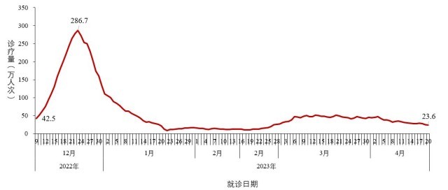 (一)總體就診人數結果。全國(不含港澳臺)發熱門診(診室)就診人數于2022年12月23日達到峰值286.7萬人次,隨后連續下降;2023年1月23日后就診人數呈現低位波動,約6周(2月24日-4月6日)的波動增加及平臺波動后,近2周(4月7日-4月20日)呈下降趨勢,4月20日為23.6萬人次,較峰值下降了91.8%(圖2-1)。
