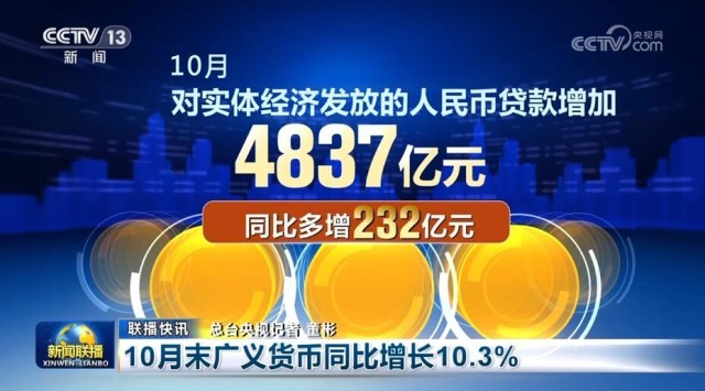 10月末廣義貨幣同比增長10.3%