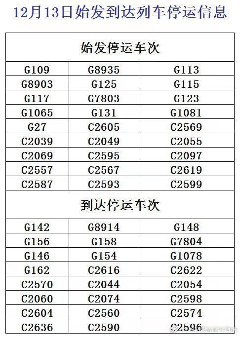 據(jù)北京西站官方微博今天中午最新消息,受降雪影響,12月13日,北京西站G57、G807、G97次列車臨時停運,北京豐臺站G63、G629次列車臨時停運。今天早上,北京西站、北京豐臺站已發(fā)布部分停運列車信息。已購買停運列車車票的旅客,可于30日內(nèi)辦理全額退票手續(xù)。請廣大旅客合理安排出行,關(guān)注車站公告或12306網(wǎng)站信息。