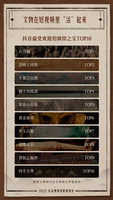通過抖音平臺的短視頻,觀眾可直接觀賞“鎮館之寶”級別的藏品,與歷史和傳統對話。報告顯示,兵馬俑、《清明上河圖》、《千里江山圖》等入選抖音最受歡迎十大鎮館之寶。真珠舍利寶幢、蓮鶴方壺、象首耳獸面紋銅罍等入選抖音關注度提升最快的文物前十名。