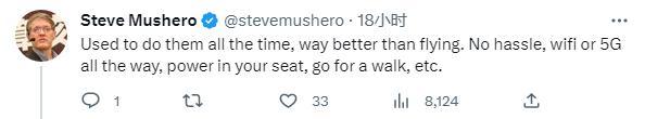 曾在中國工作多年的企業(yè)家Steve Mushero也留言說,“我以前一直坐高鐵,比坐飛機好多了。不麻煩,一直有wifi或5G,你的座位上有電源,還可以散散步等。”