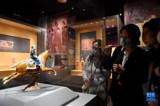 5月8日,游客在西安博物院參觀唐代三彩騰空馬。飛騰的三彩馬上騎有一胡俑,真實(shí)再現(xiàn)了絲綢之路上西域胡人急奔長安的生動(dòng)形象。