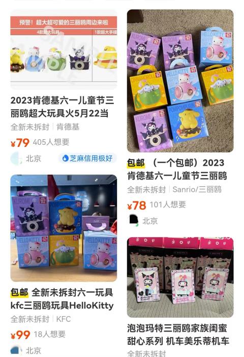 在某二手平臺,肯德基此次發售的三麗鷗玩具,標價集中在70元至100元之間,比69.9元的兒童節套餐價格更貴。麥當勞俄羅斯方塊游戲機的價格多在40元至60元之間。