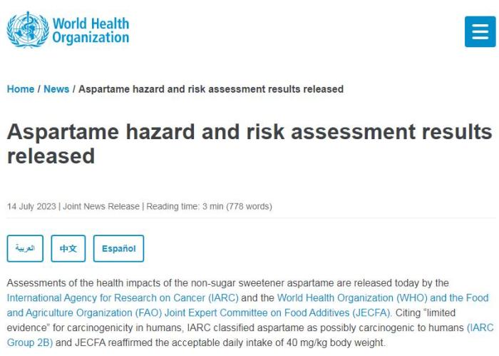 IARC引用了對人類致癌性的“有限證據”,將阿斯巴甜歸類為可能對人類致癌(IARC 2B組)一類,JECFA則重申,每日可接受的攝入量為40mg/kg體重。