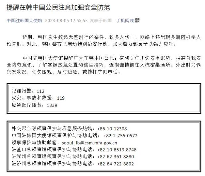中新網8月5日電 據中國駐韓國大使館微信公眾號5日消息,近期,韓國發(fā)生數起無差別行兇案件,致多人傷亡,網絡上還出現(xiàn)多篇隨機殺人預告貼。對此,韓國警方已啟動特別治安行動,加大警力部署予以強力應對。