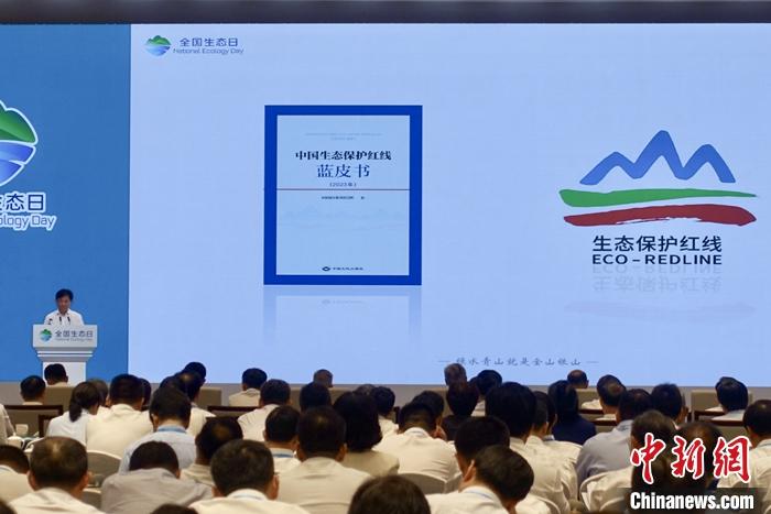 8月15日,首個全國生態日主場活動在浙江湖州舉行,中國國家發改委、中國自然資源部等部門發布碳達峰碳中和重大宣示三周年重要成果、《中國生態保護紅線藍皮書(2023年)》等多方面的成果成效。圖為《中國生態保護紅線藍皮書(2023年)》發布。 中新社記者 錢晨菲 攝