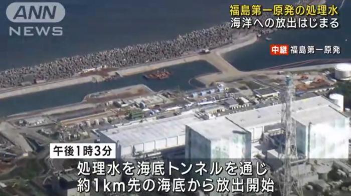 當(dāng)?shù)貢r(shí)間24日下午1時(shí)許,日本將福島核污染水排入大海。圖片來源:日本朝日電視臺(tái)視頻截圖