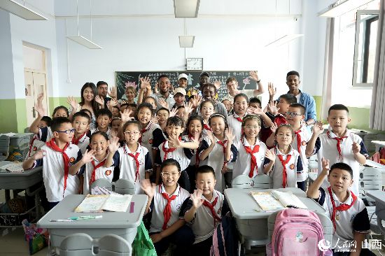 圖為選手一起和午亭小學三年級一班的同學合影留念。人民網 盧鵬宇攝