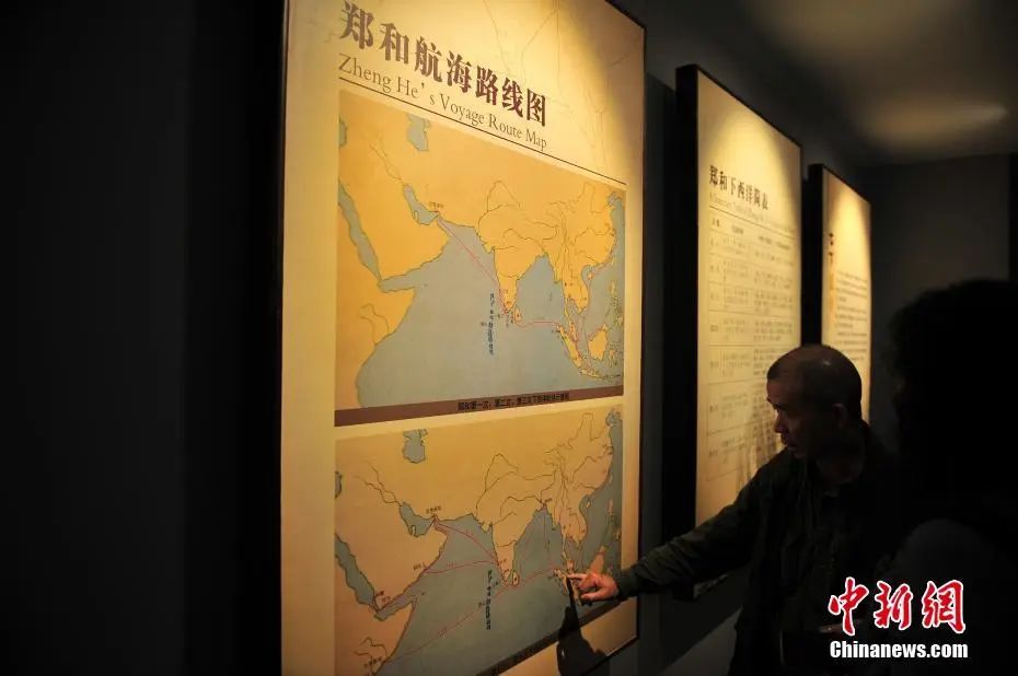 圖為觀眾在鄭和紀(jì)念館內(nèi)觀看鄭和航海線路圖。中新社記者 劉冉陽 攝