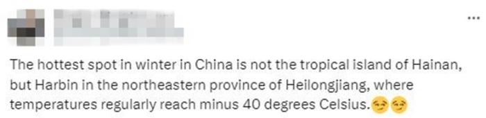 還有網(wǎng)友評論說,“中國冬天最熱的地方,不是海南島,而是黑龍江哈爾濱,盡管那里的氣溫會達(dá)到零下40攝氏度。”