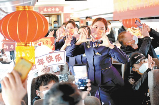 1月16日,合肥客運段工作人員在G7162次列車上為旅客表演節目,讓旅途充滿溫情。2022年春運從1月17日開始,2月25日結束,共計40天。 新華社記者 黃博涵攝