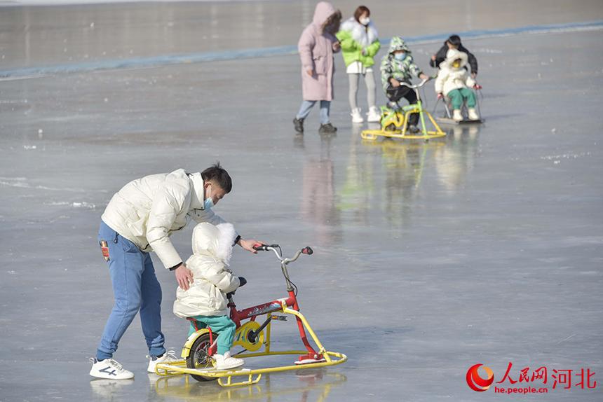 游客在遵化市山里各莊村滑冰場游玩。 張旭攝