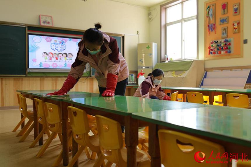 河北省邢臺市廣宗縣第一幼兒園,教職工在對教室進行清潔消毒。 王壘攝