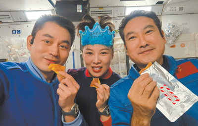 執(zhí)行迄今時間最長一次太空飛行,神舟十三號航天員趕上了第一次在太空跨年,第一次在空間站過春節(jié)。在地面團(tuán)隊的精心保障下,航天員們除夕夜為人們送上來自太空的新年祝福,在空間站度過了年味十足、充實精彩的虎年春節(jié)。從太空出艙、“天宮課堂”開講,到手控遙操作完成貨運(yùn)飛船與空間站組合體交會對接試驗,從中國女航天員首次太空漫步,到3名航天員太空飛行累計超100天,太空“出差”期間,航天員們開展了一系列空間科學(xué)實驗和技術(shù)試驗,刷新了一個又一個中國航天紀(jì)錄,為中國空間站正式建成打下堅實基礎(chǔ)。