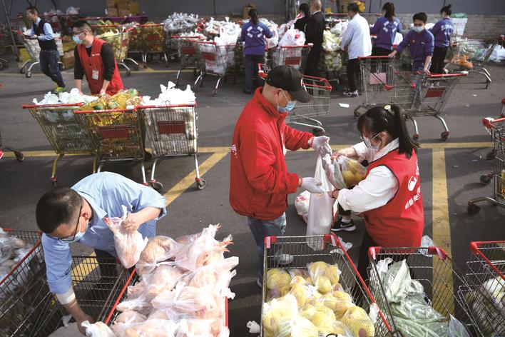 3月29日,在嘉興市區一超市秀洲店,店員們加班加點打包蔬菜、肉、油等1500份物資。這些物資將被送到“三區”,保障群眾的日常生活需求。(王振宇)