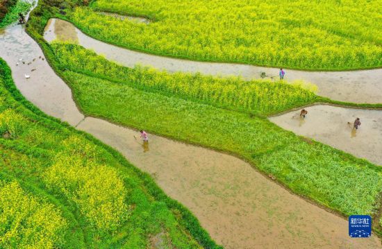 3月30日,貴州省銅仁市玉屏侗族自治縣亞魚鄉郭家灣村的農民在田間勞作(無人機照片)。