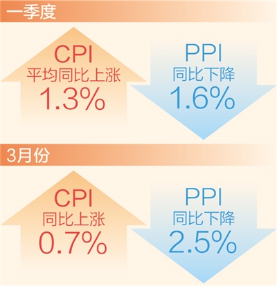 本報北京4月11日電 (記者劉志強)國家統計局11日發布數據顯示:3月份,CPI(居民消費價格指數)同比上漲0.7%,漲幅比上月回落0.3個百分點;PPI(工業生產者出廠價格指數)同比下降2.5%,降幅比上月擴大1.1個百分點。從一季度看,CPI平均同比上漲1.3%,PPI同比下降1.6%。一季度CPI持續運行在合理區間,物價保持平穩運行,為全年物價穩定奠定了堅實基礎。