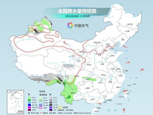 后天,內蒙古東北部、黑龍江東南部、吉林東部、新疆北部和南疆西部山區高海拔地區、西藏北部和東南部、青海西部等地部分地區有小到中雪或雨夾雪,其中,吉林東部、新疆北疆北部等地部分地區有大雪,局地暴雪。內蒙古東南部、黑龍江南部、吉林中西部、遼寧中東部、西藏東南部、云南西部和南部、河南中南部、安徽大部、江蘇中南部、湖北大部、江西中北部、湖南北部和東部、重慶、四川東部、貴州北部和東南部、廣西中西部、廣東北部等地部分地區有小到中雨,其中,遼寧東部、河南南部、安徽北部、湖南西部等地局地有大雨。