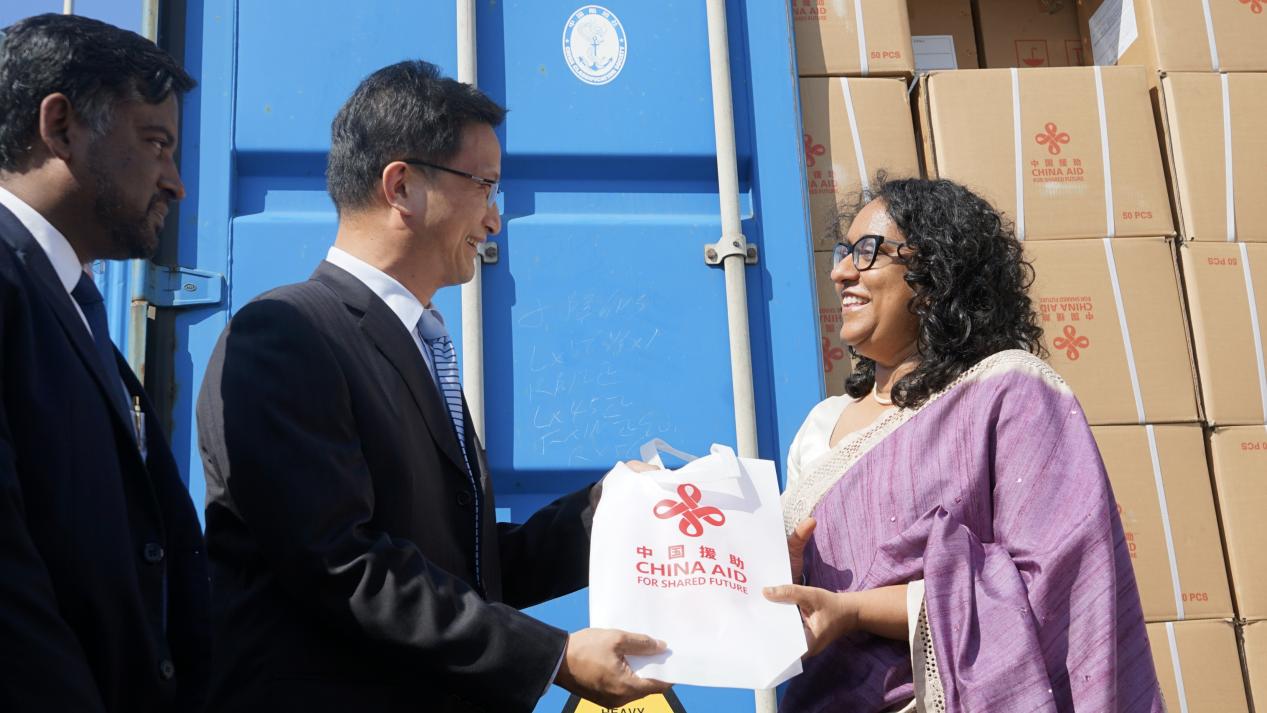 圖為2026年1月13日,中國駐斯大使戚振宏與斯總理阿馬拉蘇里亞前往科倫坡國際集裝箱碼頭迎接中國援斯2026年校服布料。來源:中華人民共和國商務(wù)部網(wǎng)站