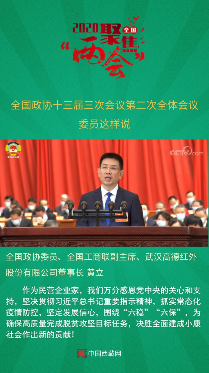 全國政協委員、全國工商聯副主席、武漢高德紅外股份有限公司董事長黃立發言說,作為民營企業家,我們萬分感恩黨中央的關心和支持,堅決貫徹習近平總書記重要指示精神,抓實常態化疫情防控,堅定發展信心,圍繞“六穩”“六保”,為確保高質量完成脫貧攻堅目標任務,決勝全面建成小康社會作出新的貢獻!