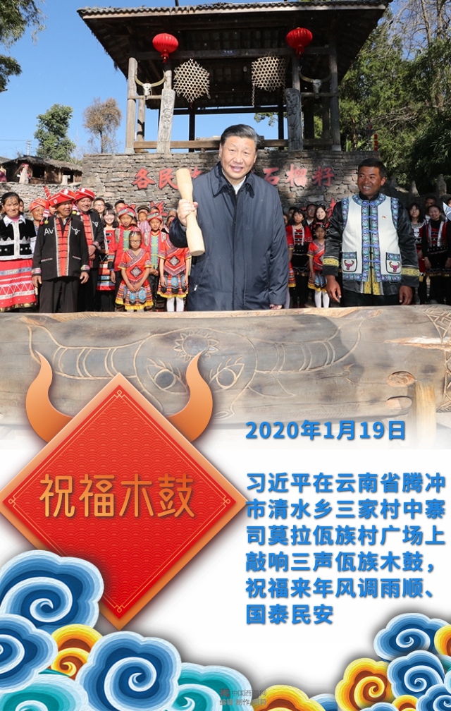 習近平在云南省騰沖市清水鄉(xiāng)三家村中寨司莫拉佤族村廣場上敲響三聲佤族木鼓,祝福來年風調(diào)雨順、國泰民安