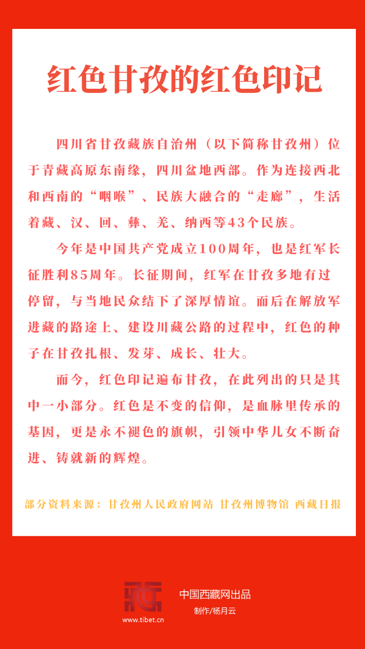 今年是中國共產黨成立100周年,也是紅軍長征勝利85周年。長征期間,紅軍在甘孜多地有過停留,與當地民眾結下了深厚情誼。而后在解放軍進藏的路途上、建設川藏公路的過程中,紅色的種子在甘孜扎根、發芽、成長、壯大。