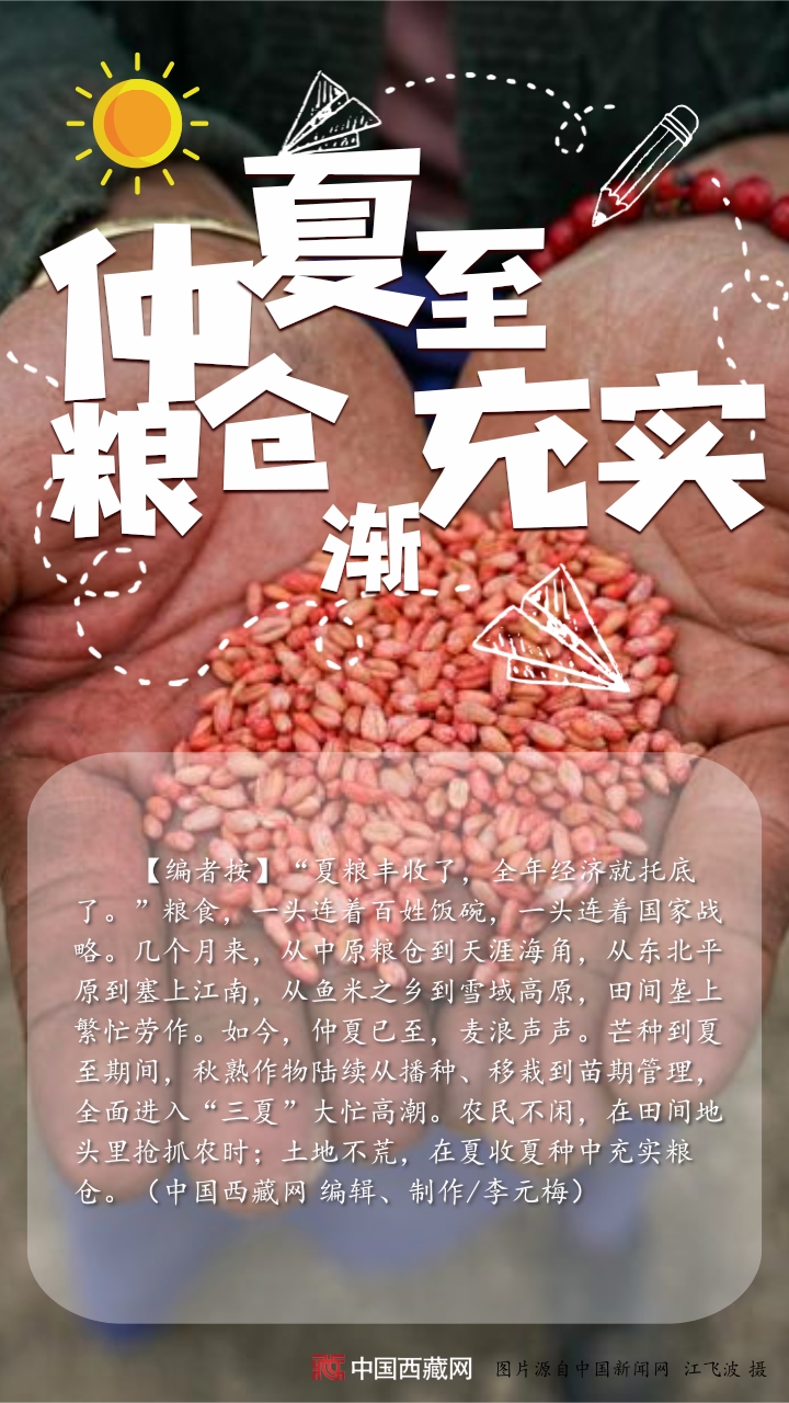 【編者按】“夏糧豐收了,全年經濟就托底了。”糧食,一頭連著百姓飯碗,一頭連著國家戰略。幾個月來,從中原糧倉到天涯海角,從東北平原到塞上江南,從魚米之鄉到雪域高原,田間壟上繁忙勞作。如今,仲夏已至,麥浪聲聲。芒種到夏至期間,秋熟作物陸續從播種、移栽到苗期管理,全面進入“三夏”大忙高潮。農民不閑,在田間地頭里搶抓農時;土地不荒,在夏收夏種中充實糧倉。(中國西藏網 編輯、制作/李元梅)