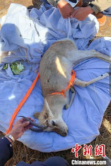 圖為達日縣森林公安局民警協同達日縣農牧局獸醫站工作人員一同對受傷藏原羚進行救助。達日縣森林公安局供圖