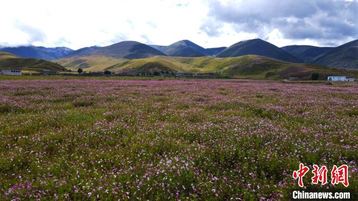 稻城縣噶通鎮(zhèn)八美村位于亞丁機(jī)場前往亞丁景區(qū)的交通要道上。長期以來,這片草原沙化現(xiàn)象日益嚴(yán)重,當(dāng)?shù)卮迕褓囈陨娴膫鹘y(tǒng)放牧都難以為繼。2016年以來,稻城縣利用生態(tài)治理工程實(shí)施的契機(jī),整合全域旅游和脫貧攻堅(jiān)等涉農(nóng)涉旅資金,在沙化草原上大面積種植格桑花,將1599畝沙化草地打造成色拉花海。