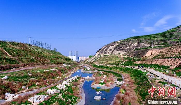 10月12日拍攝的生態修復項目治理后的火燒溝,河水清澈見底,溝壑險坡重披綠裝。 中新社記者 孫睿 攝