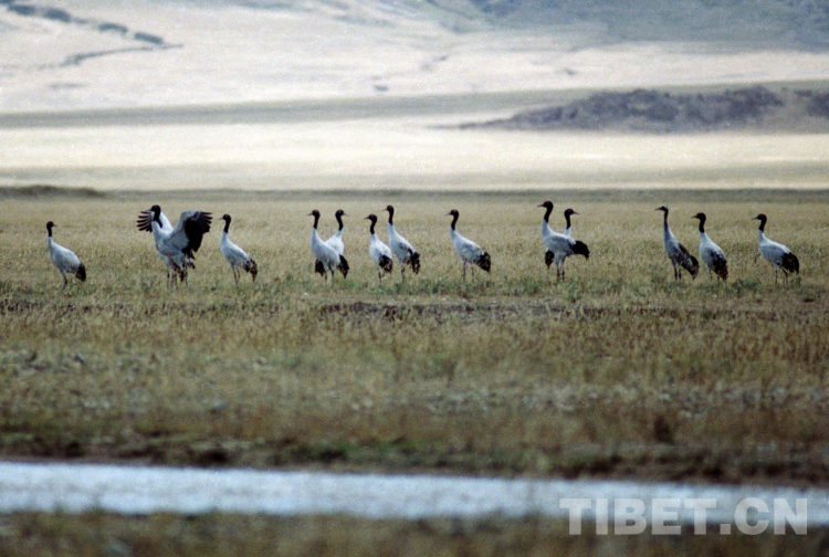 這首詩真實反映了藏北高原的面貌。這是在藏北高原申扎縣濕地棲息的國家一級保護動物黑頸鶴(唐召明2001年攝)[詳細]