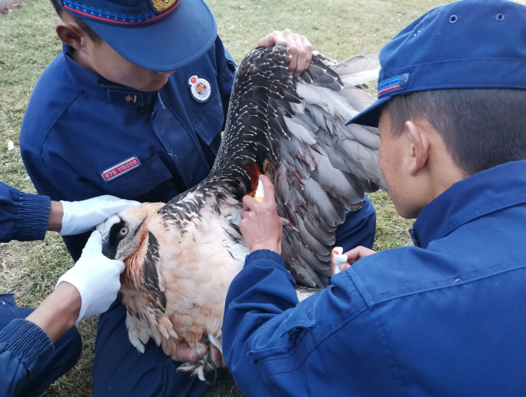 情況緊急,中隊指戰(zhàn)員立即將受傷胡兀鷲帶回中隊,安排衛(wèi)生員對其翅膀受傷部位進行了診斷、清創(chuàng)、消毒、上藥等一系列外傷緊急治療。并對其進行了強制性飲水、喂食,經(jīng)中隊指戰(zhàn)員的精心照料和治療,胡兀鷲脫離了危險,于11月20日上午與卡若區(qū)林草局野生動物救助站交接,讓工作人員將它帶回進一步觀察治療,待它健康后放歸大自然。