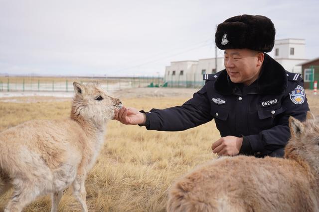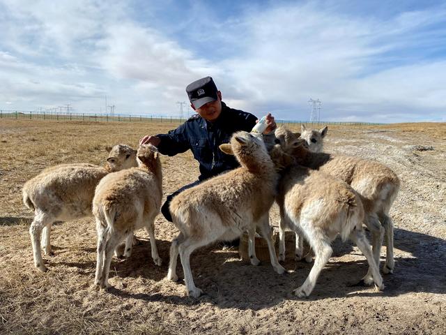 12月7日,可可西里索南達杰保護站站長趙新錄在給藏羚羊幼仔喂奶。