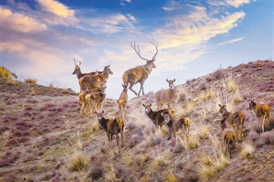 在德令哈市雅撒圖地區成群結隊的白唇鹿在山上自由奔跑、覓食。攝影:郭曲太 戴永峰