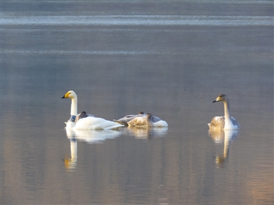 清澈平靜的河面上,幾只大天鵝聚在一起戲水,其中一只通身雪白的大天鵝脖頸處戴著一只藍白相間的“項圈”,“項圈”上刻著“IT45”的字樣。[詳細]