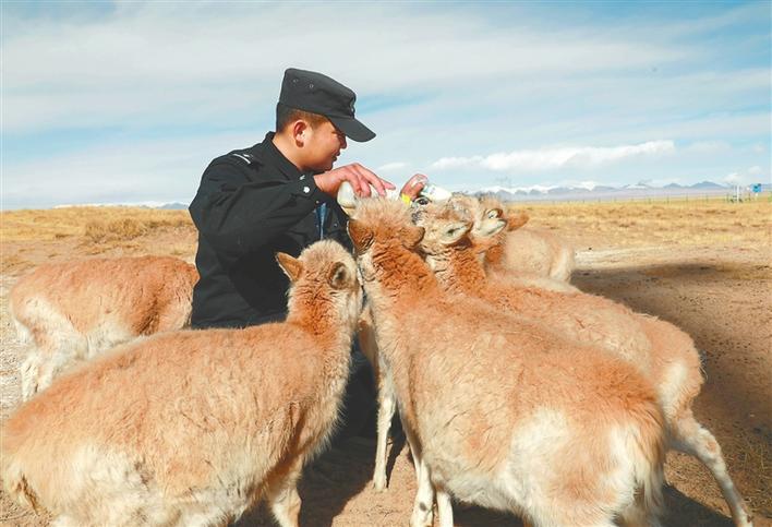 可可西里巡山隊員鄧海平給藏羚羊幼仔喂奶(2020年12月6日攝)。新華社記者 王艷 攝