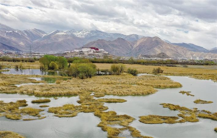 從拉薩市當熱西路上向北望去,便能看到這塊北面靠山,東、南、西三面為市區包圍,面積12.2平方公里的濕地。遠處,連綿起伏的山頂還覆蓋著薄薄的積雪,布達拉宮雄偉而秀美;近處,濕地內隨意顯現出的一塊塊水泊,成群的候鳥在水中玩耍嬉戲、在藍天白云下飛舞。拾階過橋,一條木質長廊向濕地中延伸,只是我們這些不速之客的到來,驚起水鳥無數。它們仿佛商量好似的沖上藍天,讓人為打擾它們的棲息而不安。