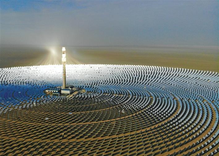 在甘肅省敦煌市向西約20公里處,被稱為“超級鏡子發電站”的首航高科敦煌100兆瓦熔鹽塔式光熱電站在戈壁灘上閃耀(2021年2月24日攝,無人機照片)。新華社記者 馬希平 攝