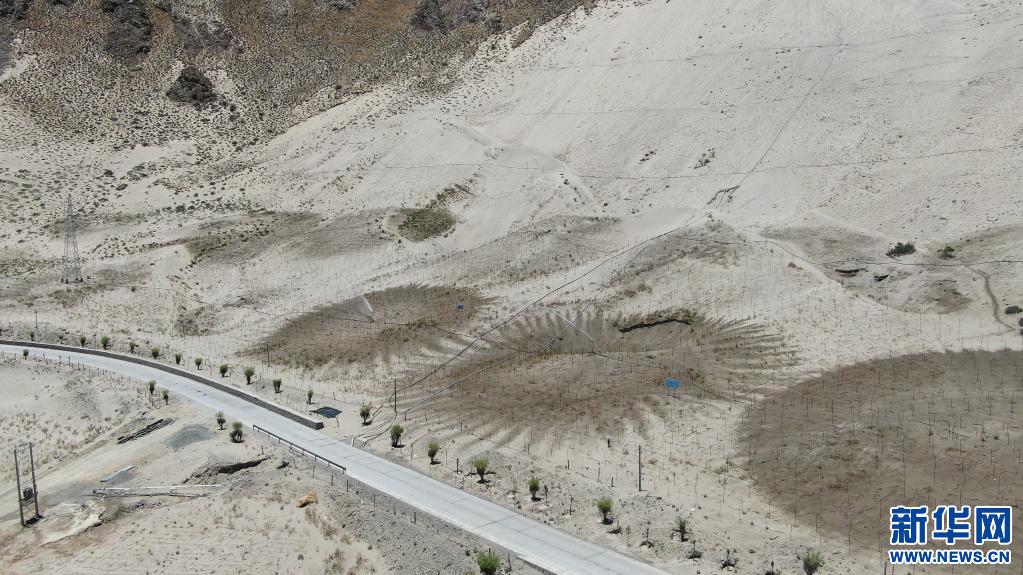 在山南市雅魯藏布江河谷地帶,村民們在維護固沙用的草方格(2019年7月14日攝)。新華社發(fā)(資料照片)