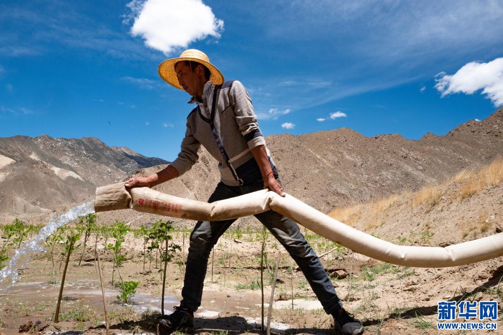 山南市貢嘎縣吉雄鎮(zhèn)劉瓊村村民正在為樹苗澆水(6月2日攝)。新華社記者 普布扎西 攝