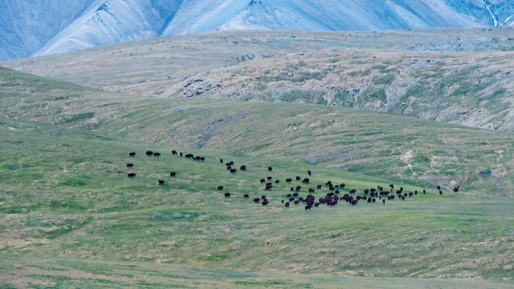 日前,青海省玉樹藏族自治州曲麻萊縣曲麻河鄉昂拉村生態管護員濤西昂扎在雜日尕吶山巡護途中拍攝到了一個極為震撼、又特別罕見的場面:一個種群數量達二三百頭的野牦牛群正在悠閑地吃草。