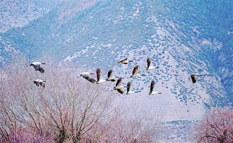 黑頸鶴是世界上唯一生長、繁殖在高原的鶴類,通?;顒佑诤0?000米以上的開闊農田、河谷和濕地,屬國家一級保護動物,林芝是黑頸鶴的重要棲息地之一。據北京林業大學郭玉民教授團隊跟蹤監測,10月30日以來,今年首批黑頸鶴順利從青海湖附近繁殖地返回林芝越冬地,遷徙直線距離超過1100公里。
