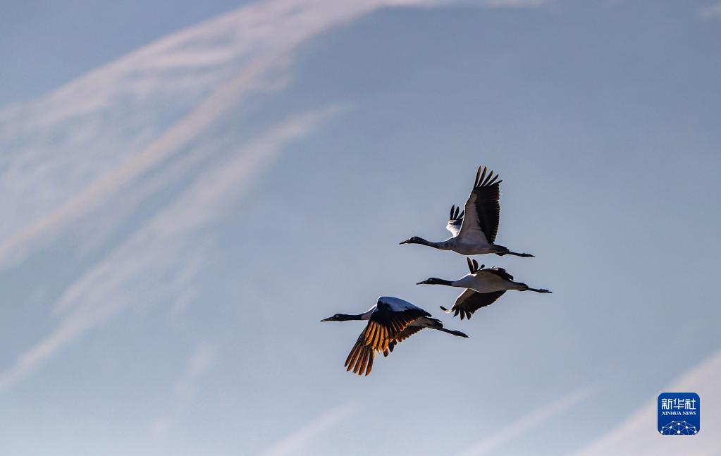 黑頸鶴在林周縣黑頸鶴自然保護區上空盤旋(11月6日攝)。新華社記者 張汝鋒 攝