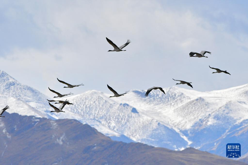 黑頸鶴群飛過林周縣強嘎鄉境內山梁(11月6日攝)。新華社記者 姜帆 攝