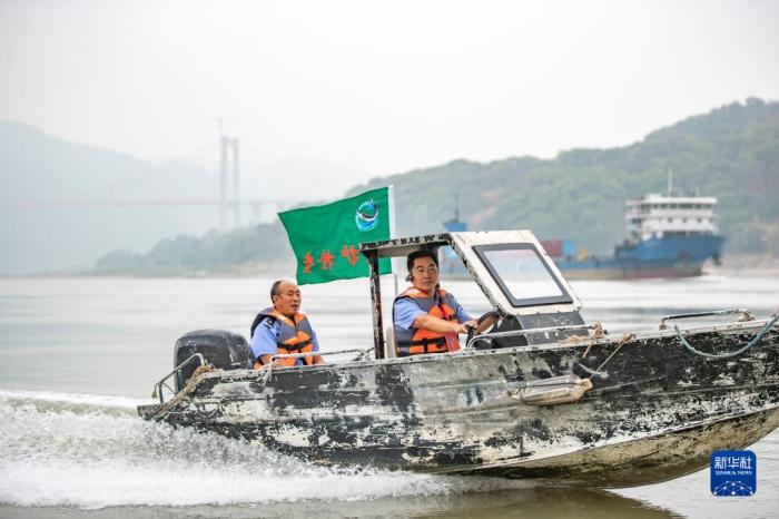 鴻鵠護(hù)魚(yú)志愿隊(duì)隊(duì)長(zhǎng)劉鴻(右)帶領(lǐng)隊(duì)員在長(zhǎng)江重慶江津段巡護(hù)(2022年9月2日攝)。新華社記者 黃偉 攝