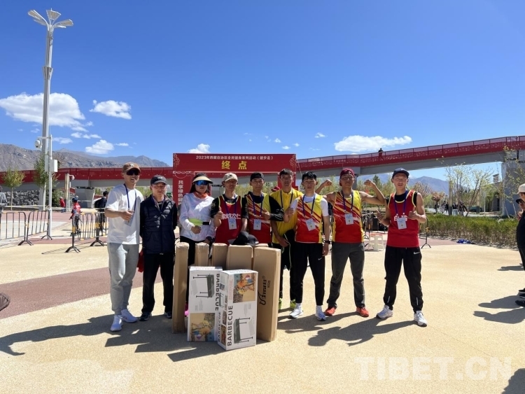 隨后其他組也紛紛來到終點,憑自己的名次到各個領獎處拿獎勵,拍紀念照,現場十分熱鬧。“我們是北高的學生,通過體育老師得知這個活動,便報名參賽,活動很有意義,不僅對強身健體有幫助,還能帶動全民健身的氛圍,”在健步走活動中獲得第六組第一名的拉薩市北京高級中學學生旦增美朗說。