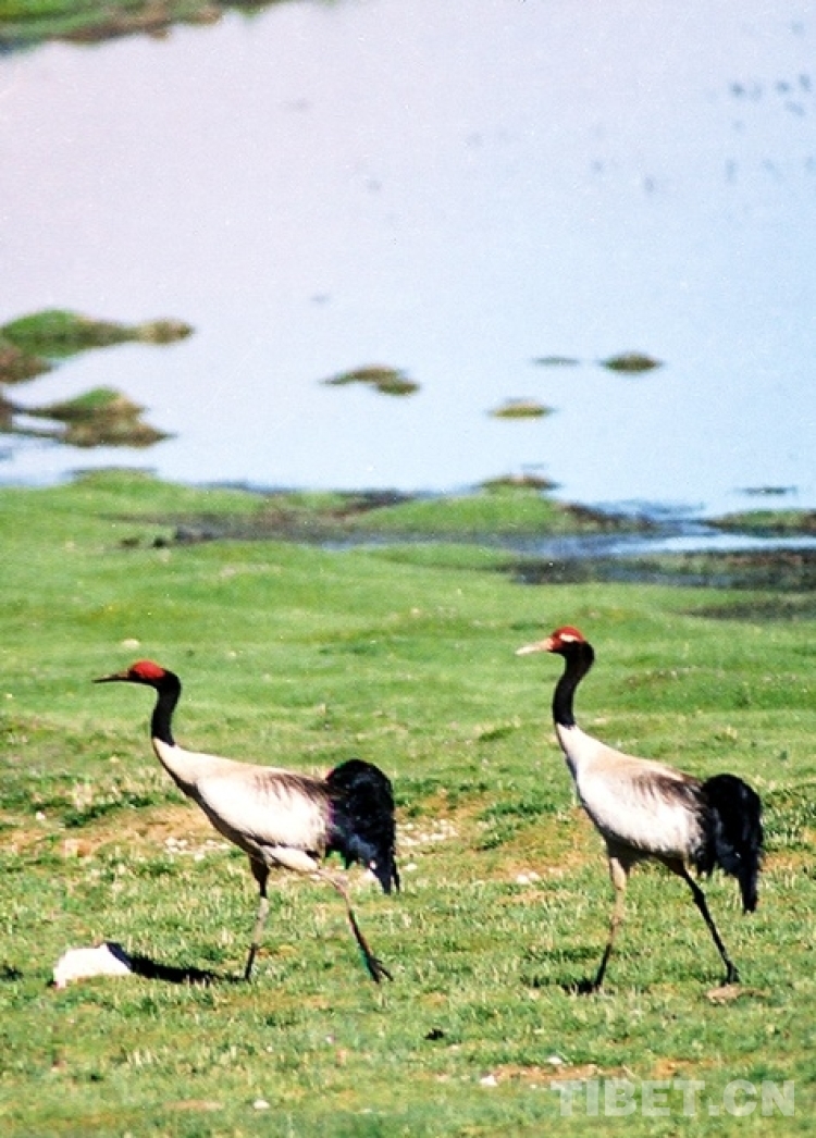這是兩只漫步在藏北色林錯國家級自然保護(hù)區(qū)的國家一級保護(hù)動物、被稱為“鳥類熊貓”的黑頸鶴(唐召明2001年攝)