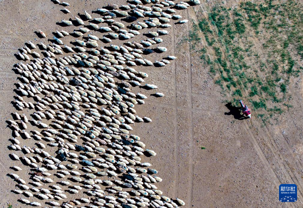 牧民在阿里地區(qū)日土縣班公湖畔放牧白絨山羊(無人機(jī)照片,9月21日攝)。新華社記者 姜帆 攝